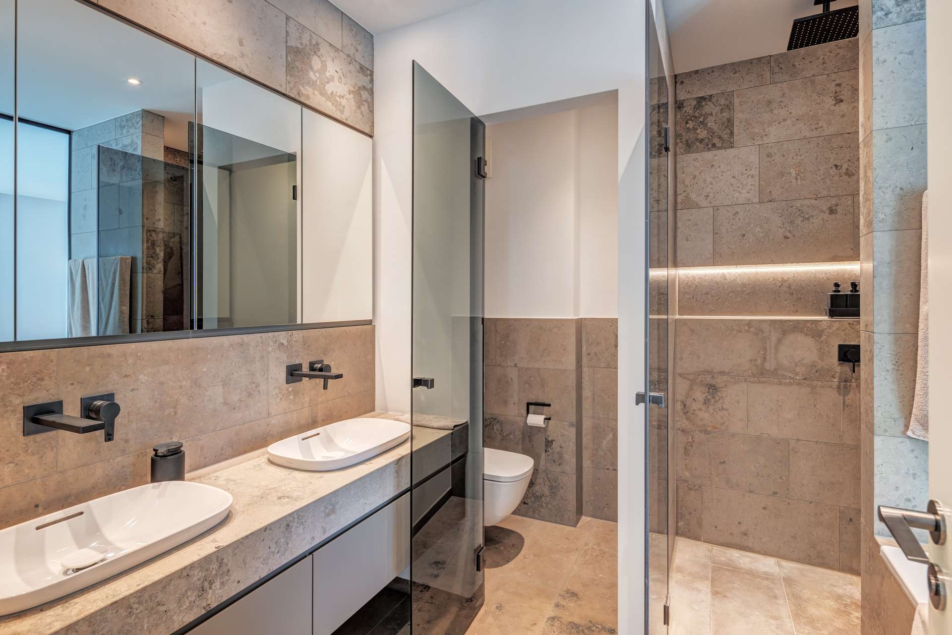 Komfort auf höchstem Niveau bieten das Smart-Home-System von GIRA mit Licht-, Klingel- und Raffstoresteuerung, Klimaanlagen in Wohn- und Schlafbereich, elektrisch betriebene Raffstoren von ROMA, eine Markise von Markilux, Fußbodenheizung sowie Abhangdecken mit Downlights. Edle Details wie Türdrücker von Olivari, eingeputzte Vorhangschienen und eine Bodensteckdose im Wohnbereich runden das exklusive Gesamtbild ab.