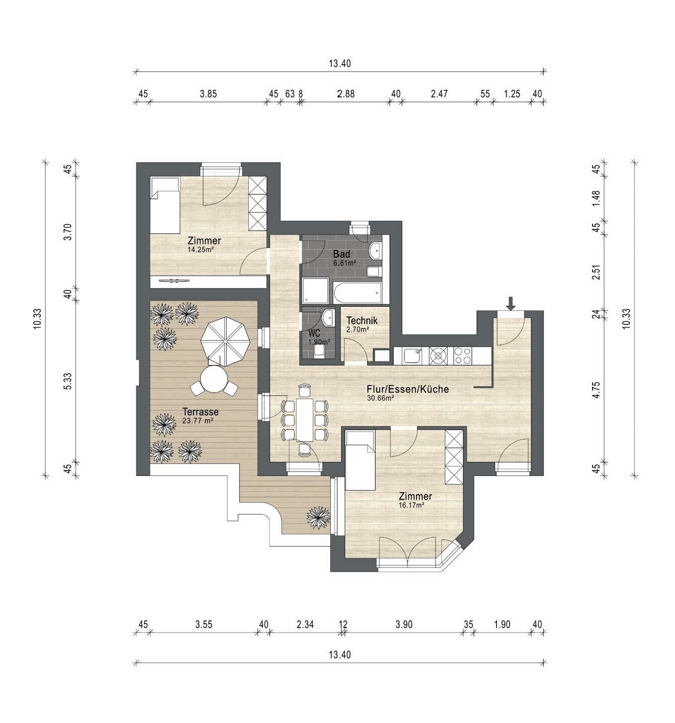 Die angebotene 3-Zimmer-Penthousewohnung mit rund 89,46 m² Wohnfläche überzeugt durch ihren hellen, offenen Grundriss und eine hochwertige Ausstattung. Der großzügige Wohn-, Ess- und Küchenbereich mit direktem Zugang zur rund 23,77 m² großen Sonnenterrasse bildet das Herzstück der Wohnung und schafft ein einladendes Ambiente zum Entspannen und Genießen. Zwei Schlafzimmer, ein Badezimmer, ein separates Gäste-WC, eine Diele, ein Kellerabteil (Nr. 14) sowie ein Tiefgaragenstellplatz (Nr. 230) ergänzen das durchdachte Wohnkonzept.
