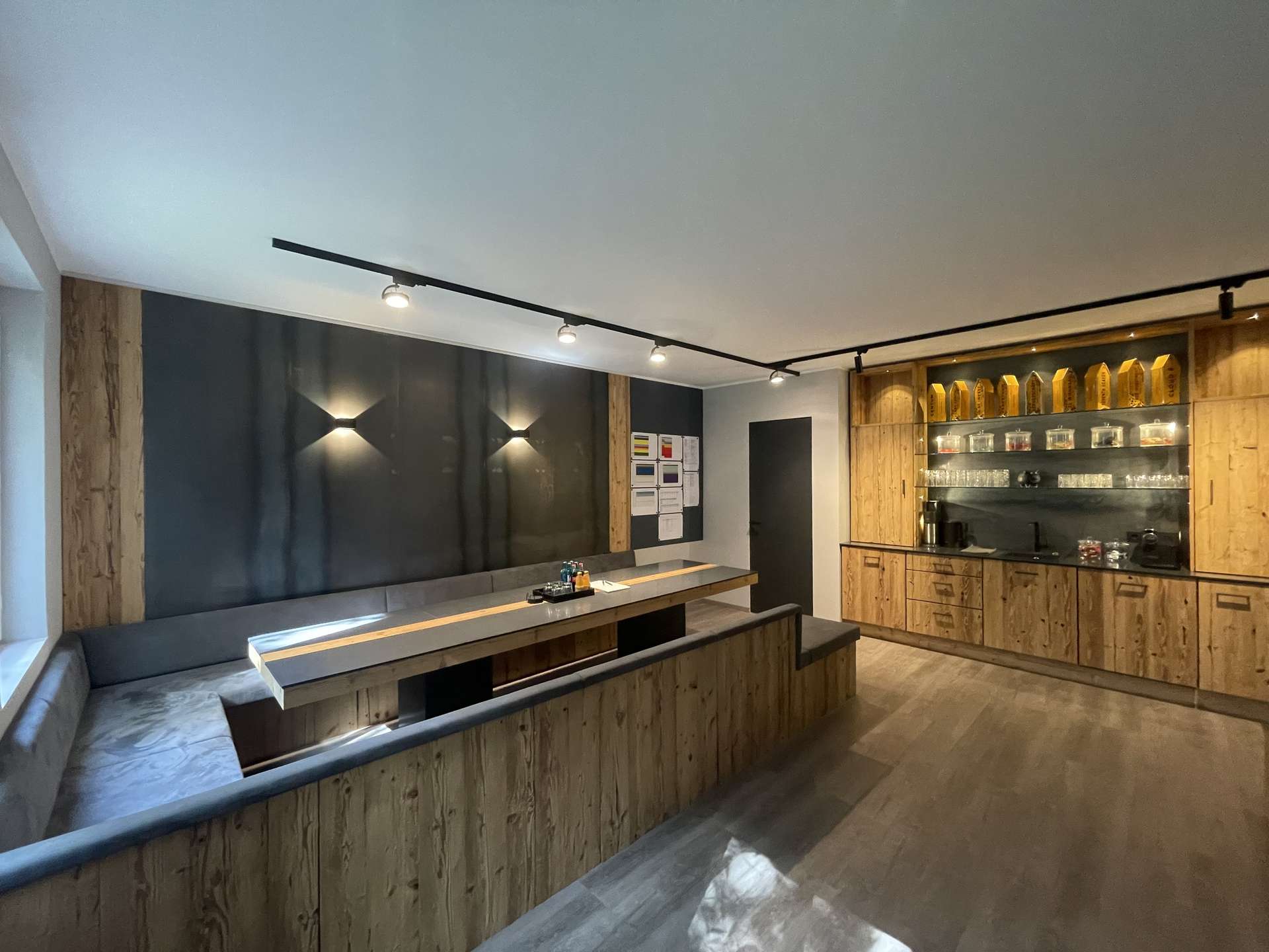 Das Herzstück bildet der großzügige Küchen- und Besprechungsbereich, ausgestattet mit einer Designer-Küche aus Holz in Contemporary Timber-Design. Eine lange, im gleichen Stil gehaltene Tafel bietet Platz für mindestens zwölf Personen – ideal für Teammeetings, Besprechungen oder Workshops. Moderne Lampen runden das harmonische Licht- und Raumkonzept ab und sorgen für ein behagliches Wohlfühlklima.