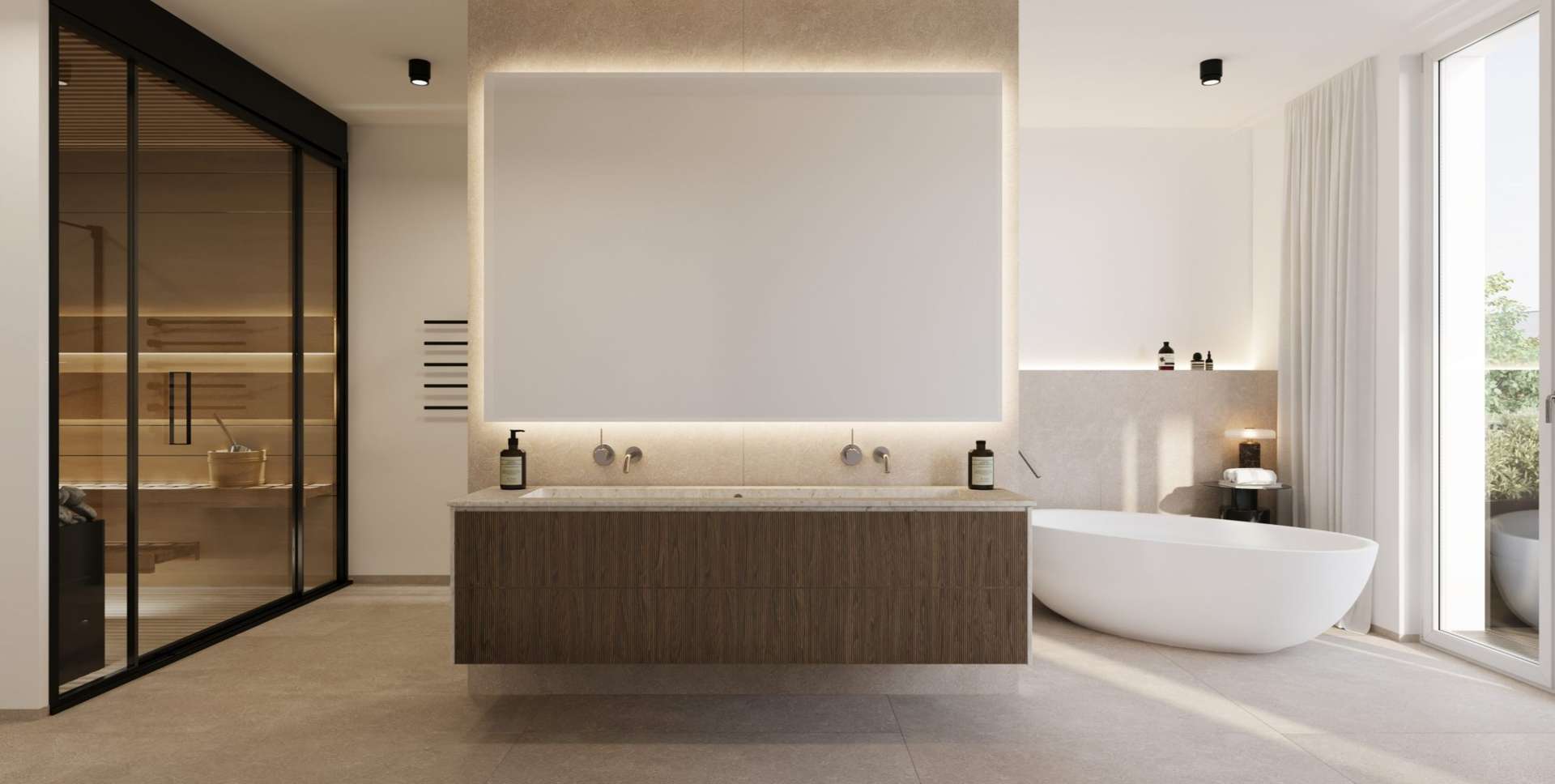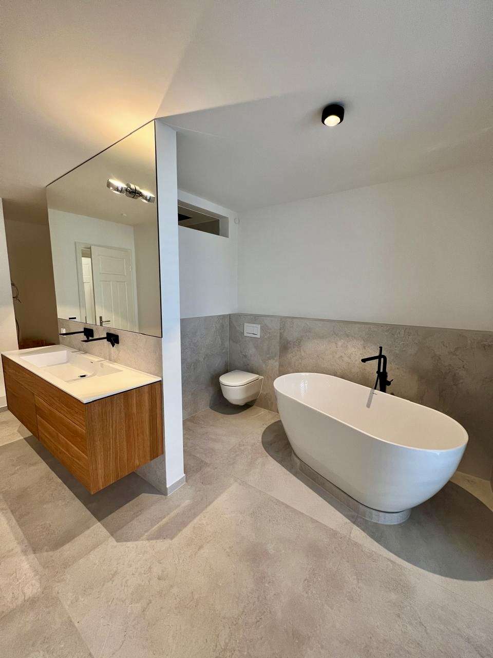 - Bad/WC mit Wellnesscharakter (u. a. Badewanne, Dusche, Doppelwaschtisch gemäß Grundriss)