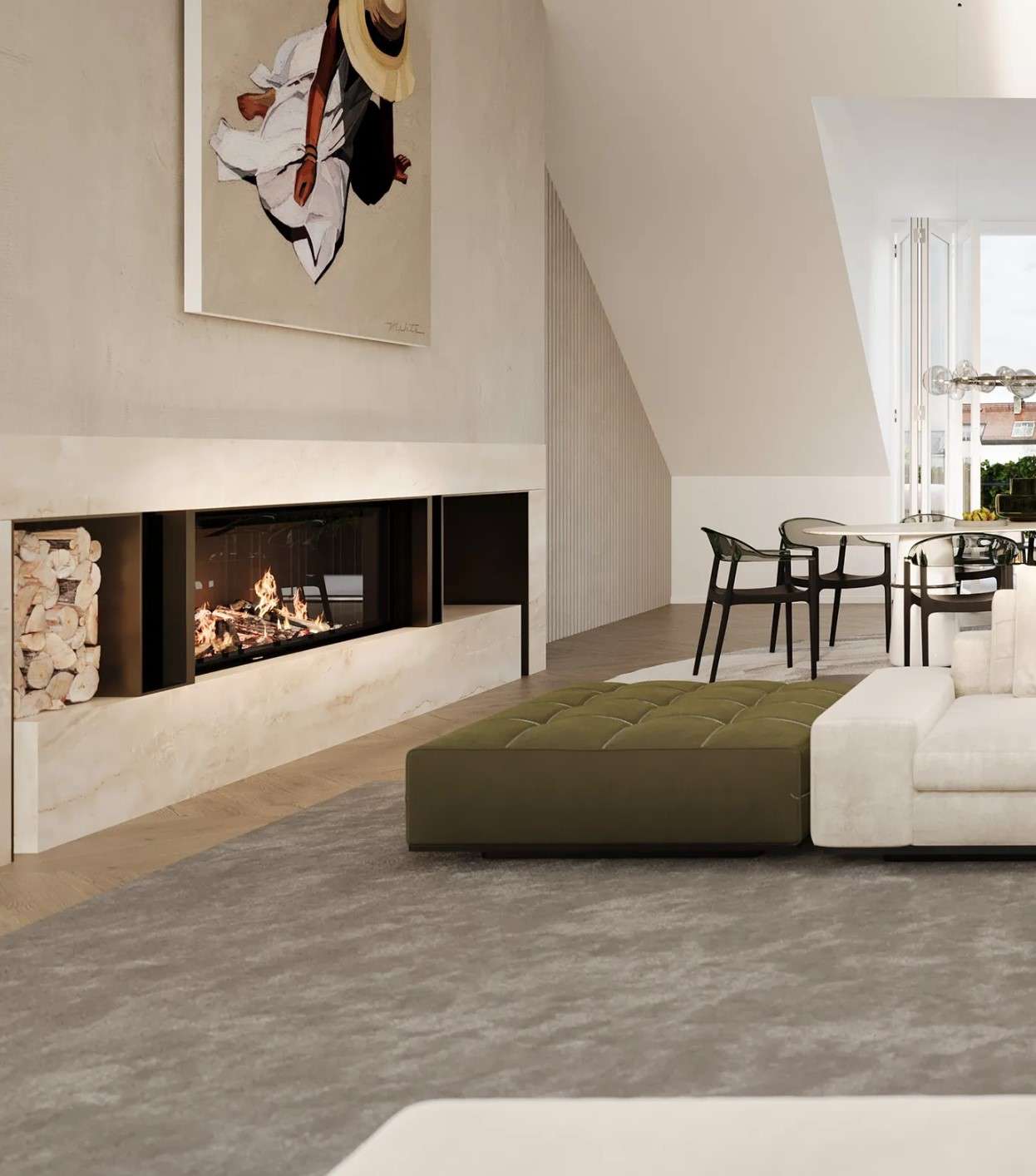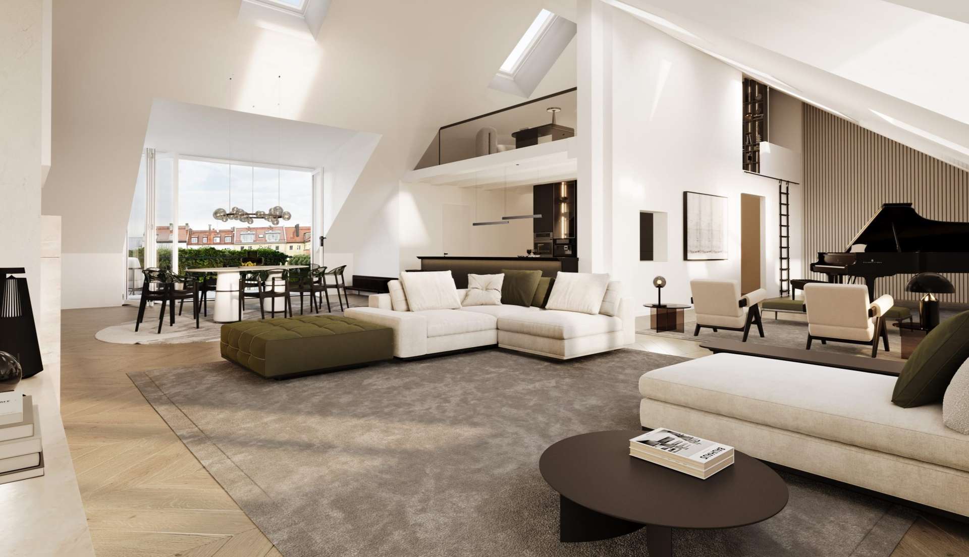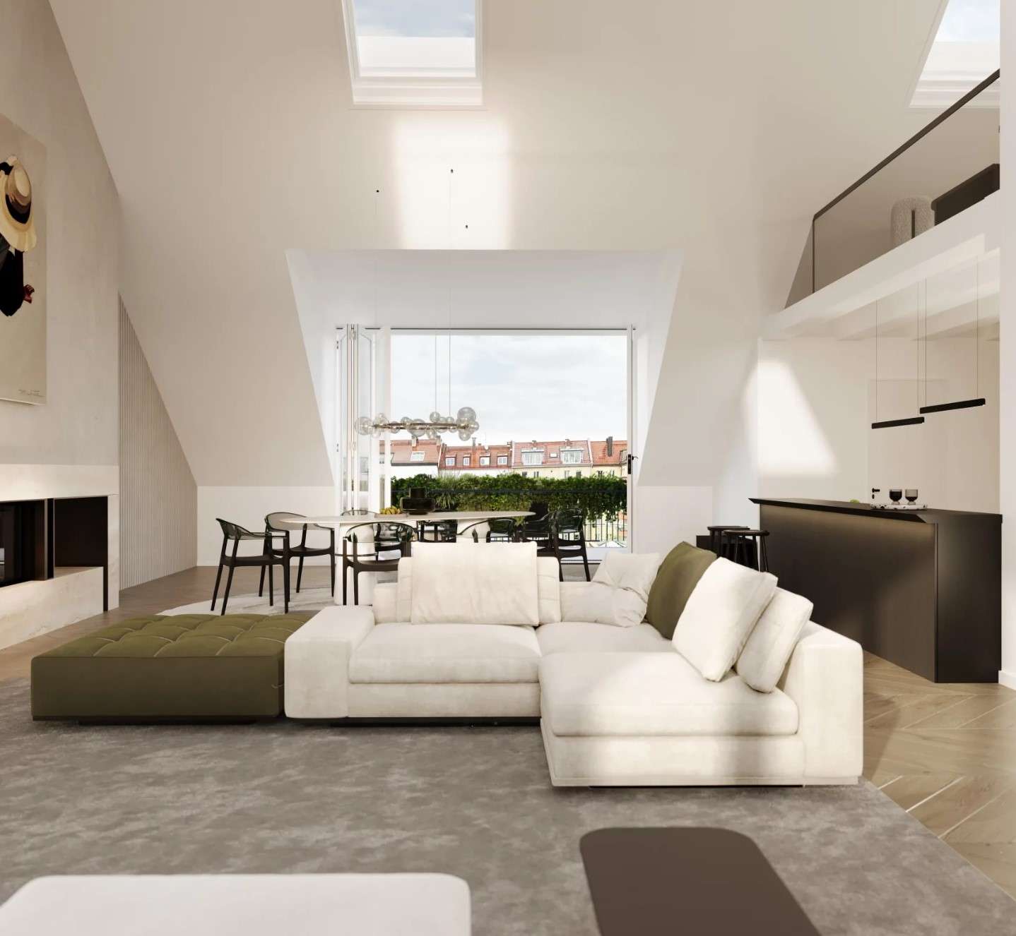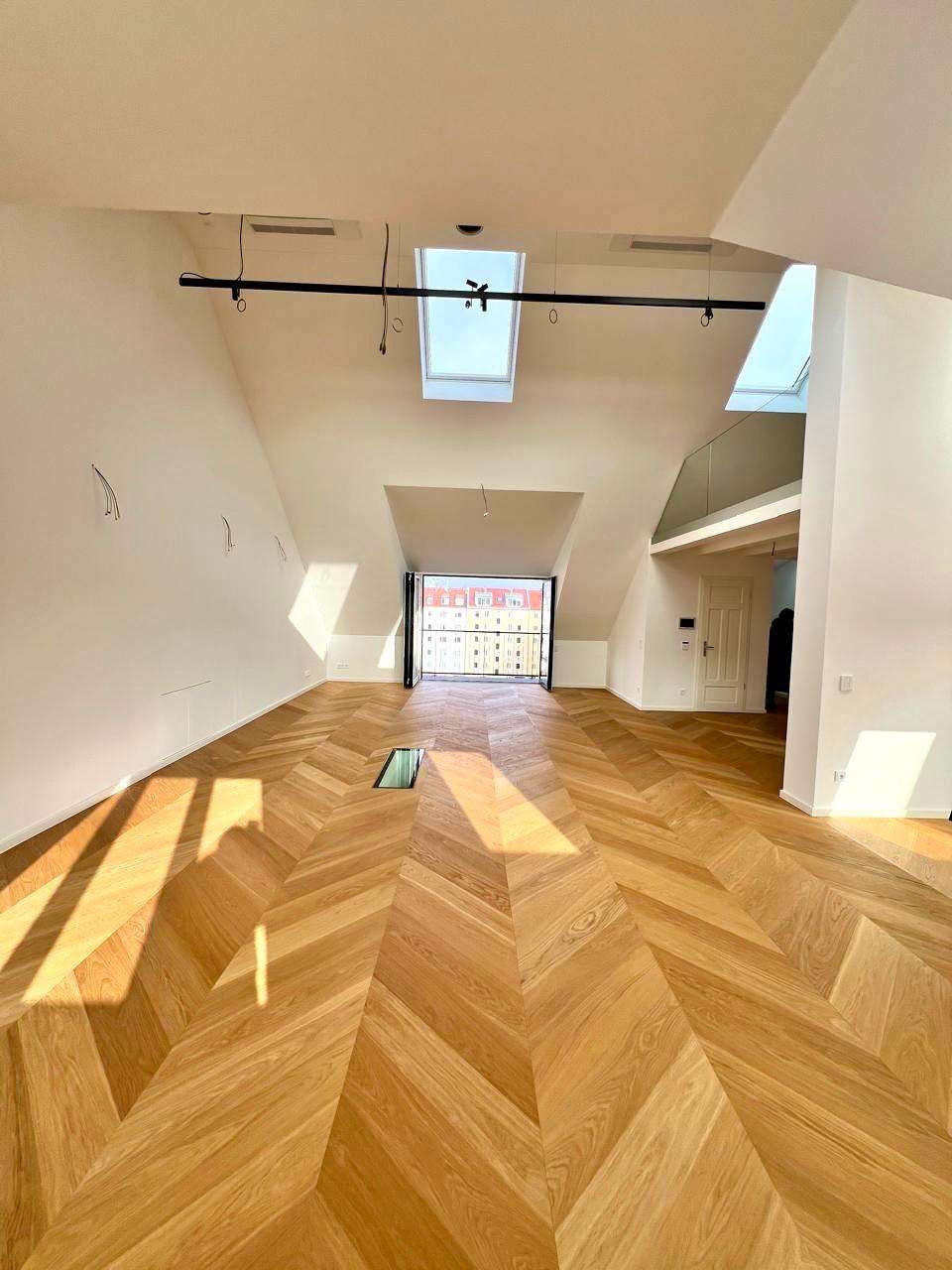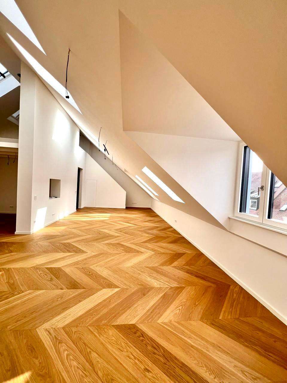 Bereits beim Betreten wird die besondere Architektur spürbar: Großzügige Grundrisse, klare Linien und ein durchdachtes Raumkonzept schaffen eine Atmosphäre von Weite und Leichtigkeit. Das Dachgeschoss bildet das Herzstück der Wohnung. Hier eröffnet sich ein außergewöhnlich großzügiger Wohn- und Essbereich mit einer beeindruckenden Raumhöhe von ca. 4,90 Metern, der dem Raum eine loftartige Qualität verleiht. Großflächige Fensterflächen sorgen für viel Tageslicht und unterstreichen den offenen, urbanen Charakter.